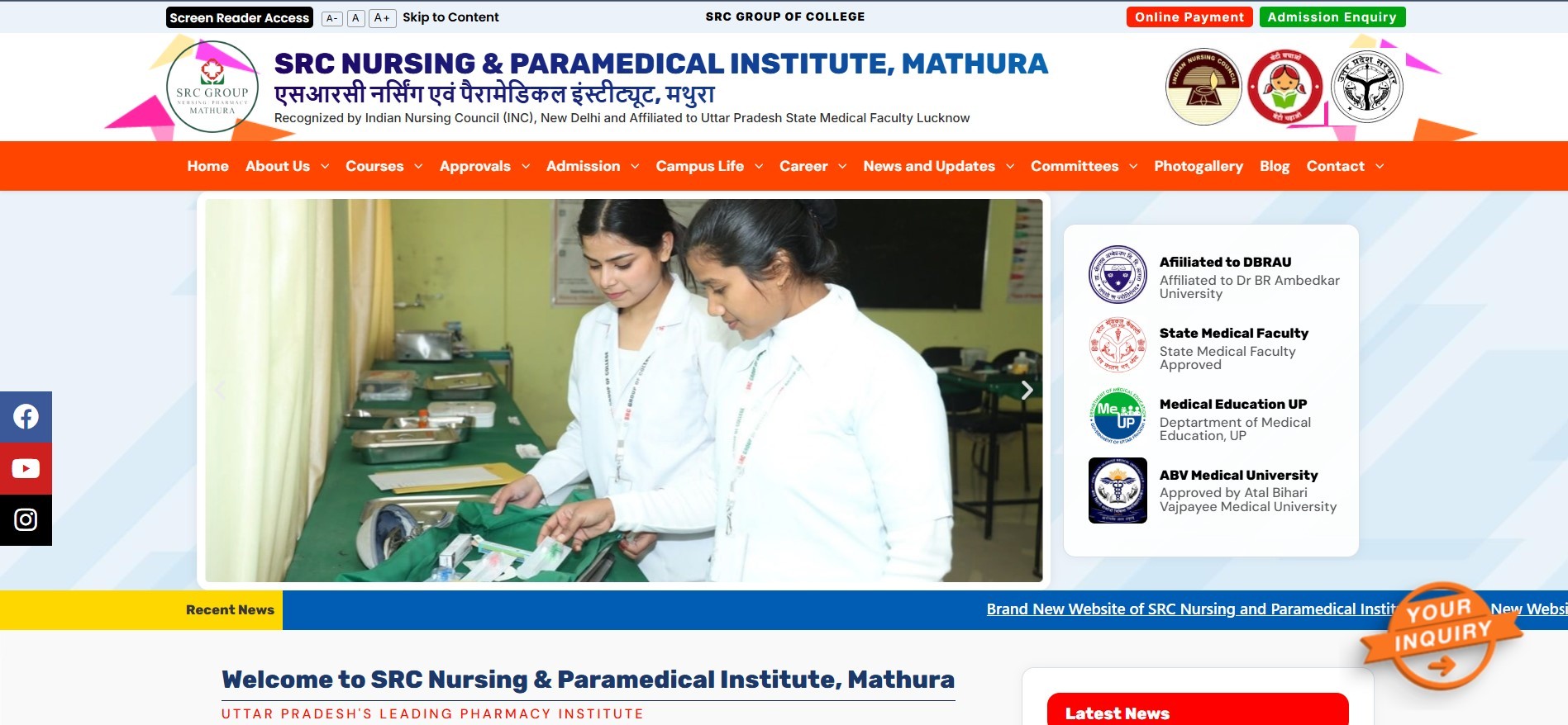 SRC Nursing & Paramedical Institute, Mathura, founded in 2016, is a premier private institution offering Undergraduate and Diploma level courses in Nursing, Pharmacy, Physiotherapy, and Optometry. The institute is affiliated with Atal Bihari Vajpayee Medical University and recognized by national councils ensuring quality healthcare education. The campus is designed to provide a comprehensive learning environment with well-furnished labs, hostels, and medical facilities.